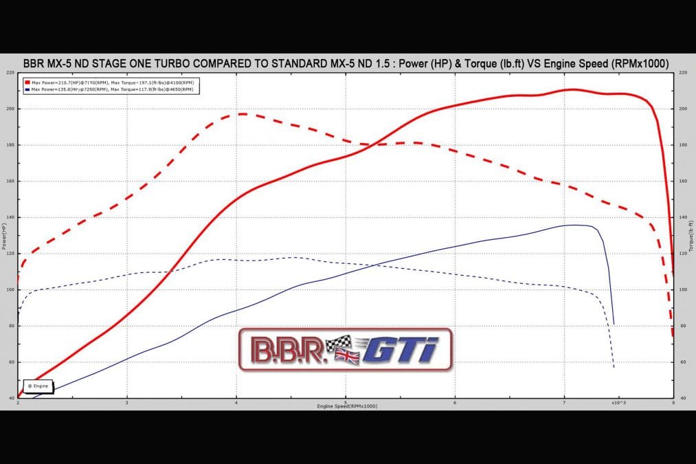 Tuning specialist BBR has revealed its first turbocharger upgrade for the current 1.5-litre Mazda MX-5. Available for both the soft-top roadster and RF versions, the bespoke Stage One installation raises power to 210bhp and torque to 197lb ft.